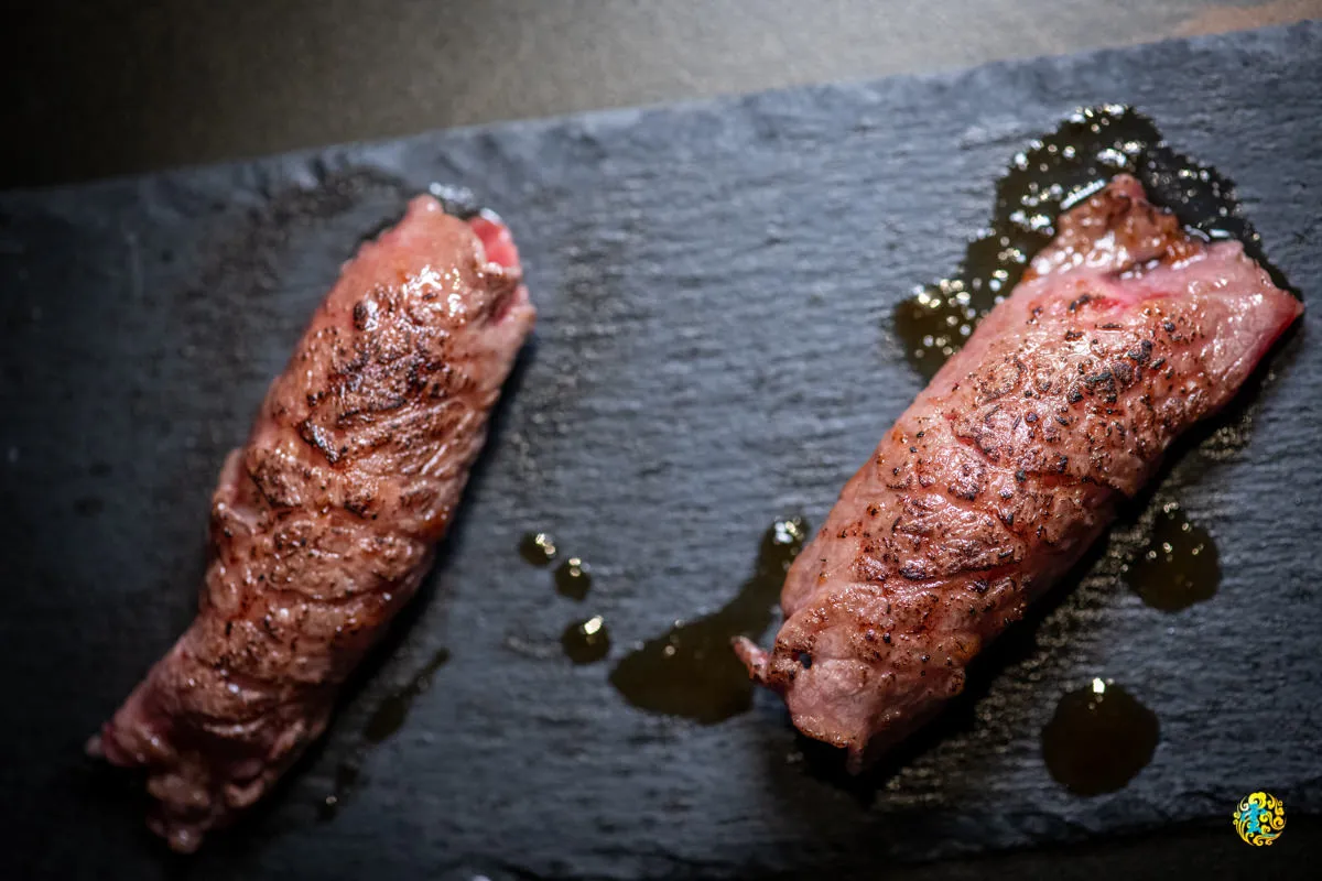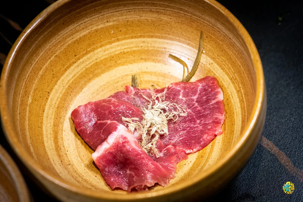 主菜皆提供桌邊服務,透過服務生專業的手藝,精準的熟度呈現出漂亮的霜降油花與絕佳的油脂品質,那奢華的濃郁豐美令人悸動,沾點蛋黃,那馥郁的蛋香一股腦的衝入鼻腔,卻沒有喧賓奪主,不只讓和牛更加濕潤,也交織出華麗的味蕾體驗,滑溜彈嫩在舌尖留下鮮嫩多汁的難忘滋味。