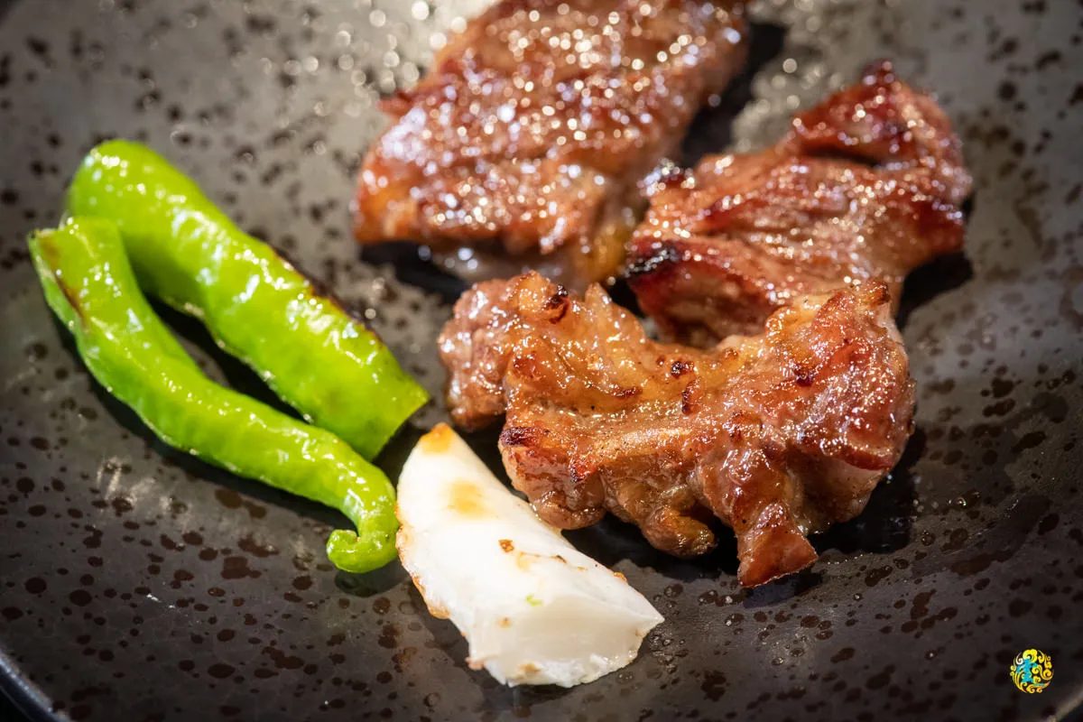 牛肋條帶筋有肉有油花,建議可以烤的焦一些,口感會更好。山上走走提供青椒與年糕做搭配,有脆有軟的豐富層次,饒富趣味的咀嚼感受與美味深度。