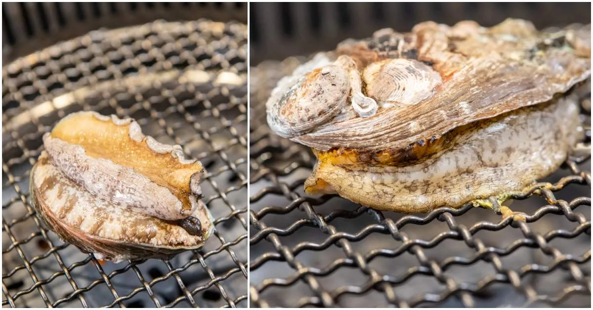 對於不吃牛的顧客,山上走走會將套餐中的和牛盛合替換成南非大鮑魚。上桌時還是活體說,店員建議烤的時候,上下兩面各烤約2分鐘左右,之後會再拿去廚房進行額外的烤製。