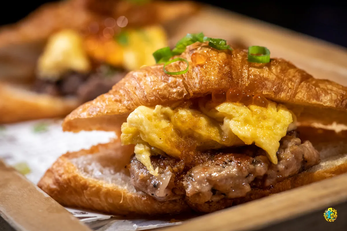 不吃牛的話,肉品會換成豬絞肉,可頌包著歐姆蛋、鮭魚卵跟蔥花。有彈性的鮭魚卵入口時會自己啵啵啵的化開,歐姆蛋濃醇的風味讓滑順的牛肉更加美味。建議盡快食用,不然可頌會軟掉影響口感。
