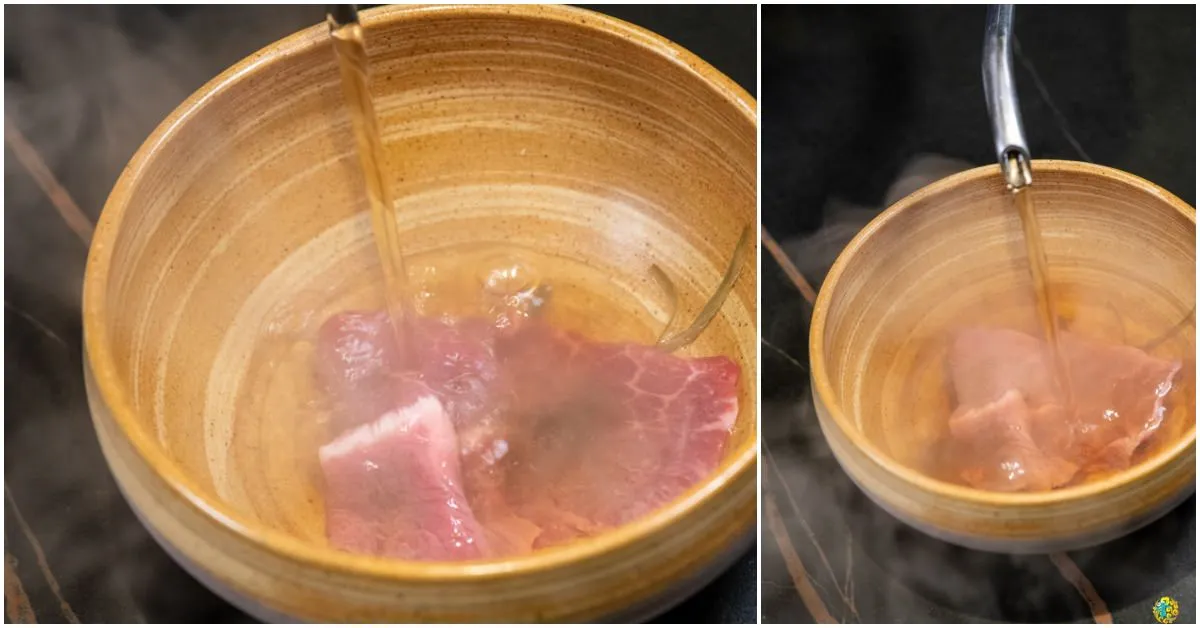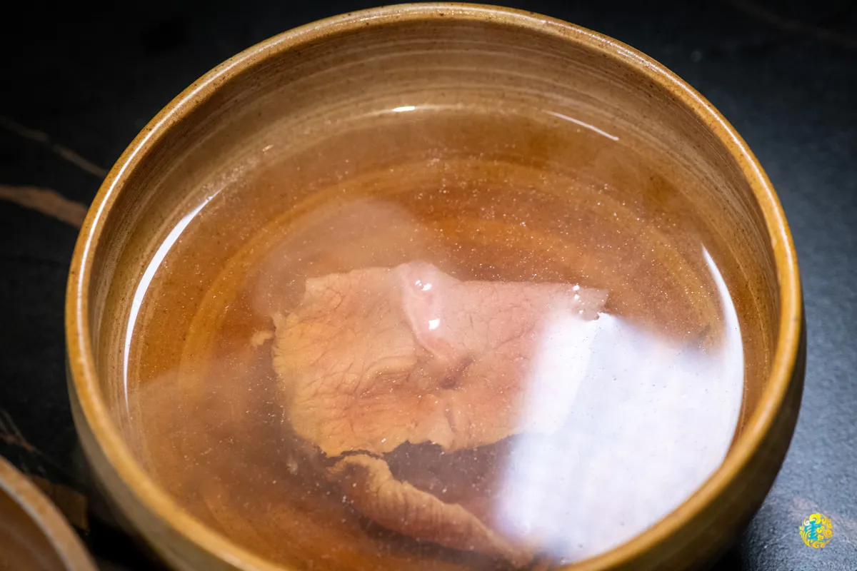 最上方的是昆布鹽,透過熱湯現沖,湯頭的部分選用宜蘭櫻桃鴨的鴨骨去熬煮,當鮮味被濃縮到一個極致的時候,大部分的人會覺得湯太鹹,山上走走的剝皮辣椒牛肉湯也是給人這種感覺。滑嫩的牛肉配上熱湯,嚐起來清甜美味,鴨香、牛肉、剝皮辣椒與昆布的另類碰撞,互不搶味又各自精彩。