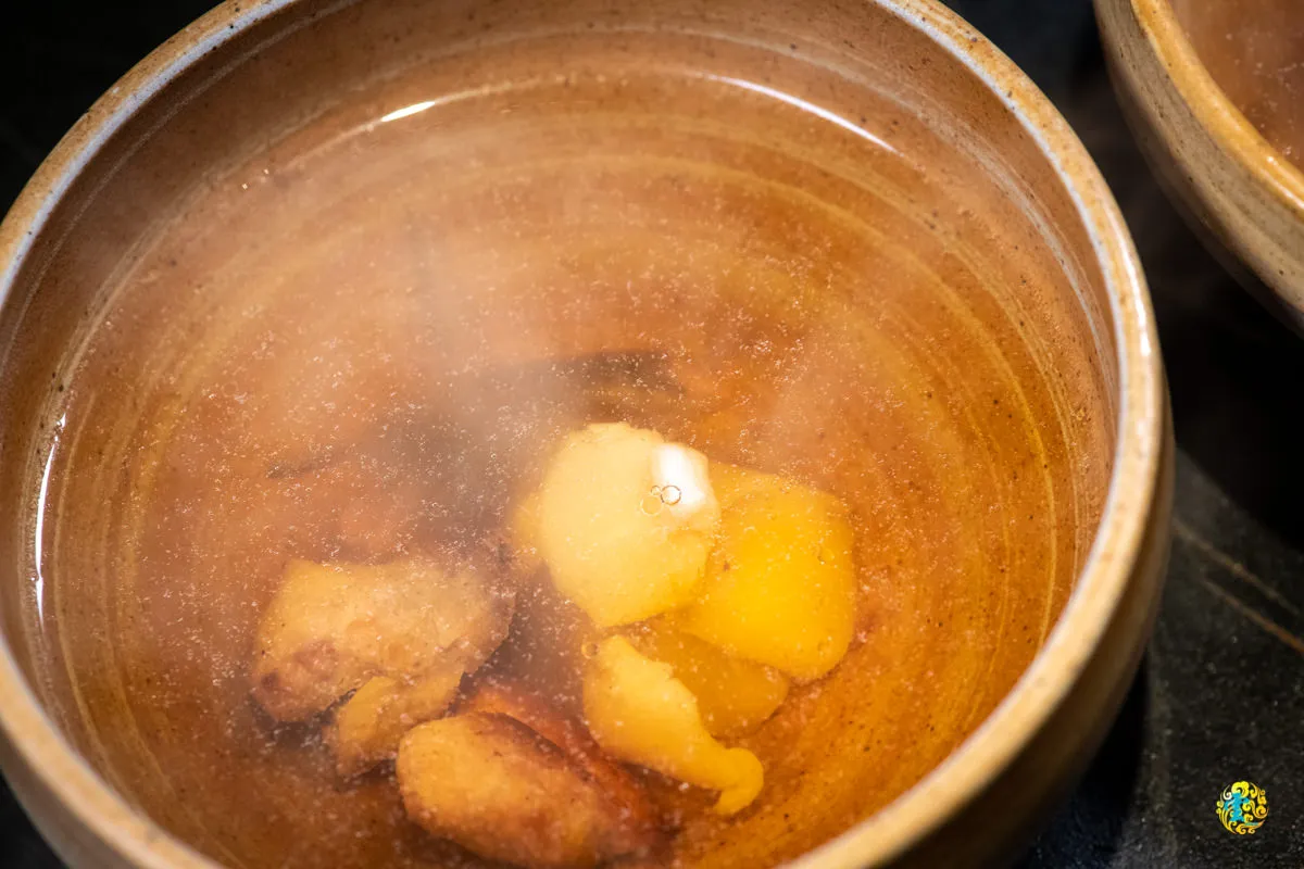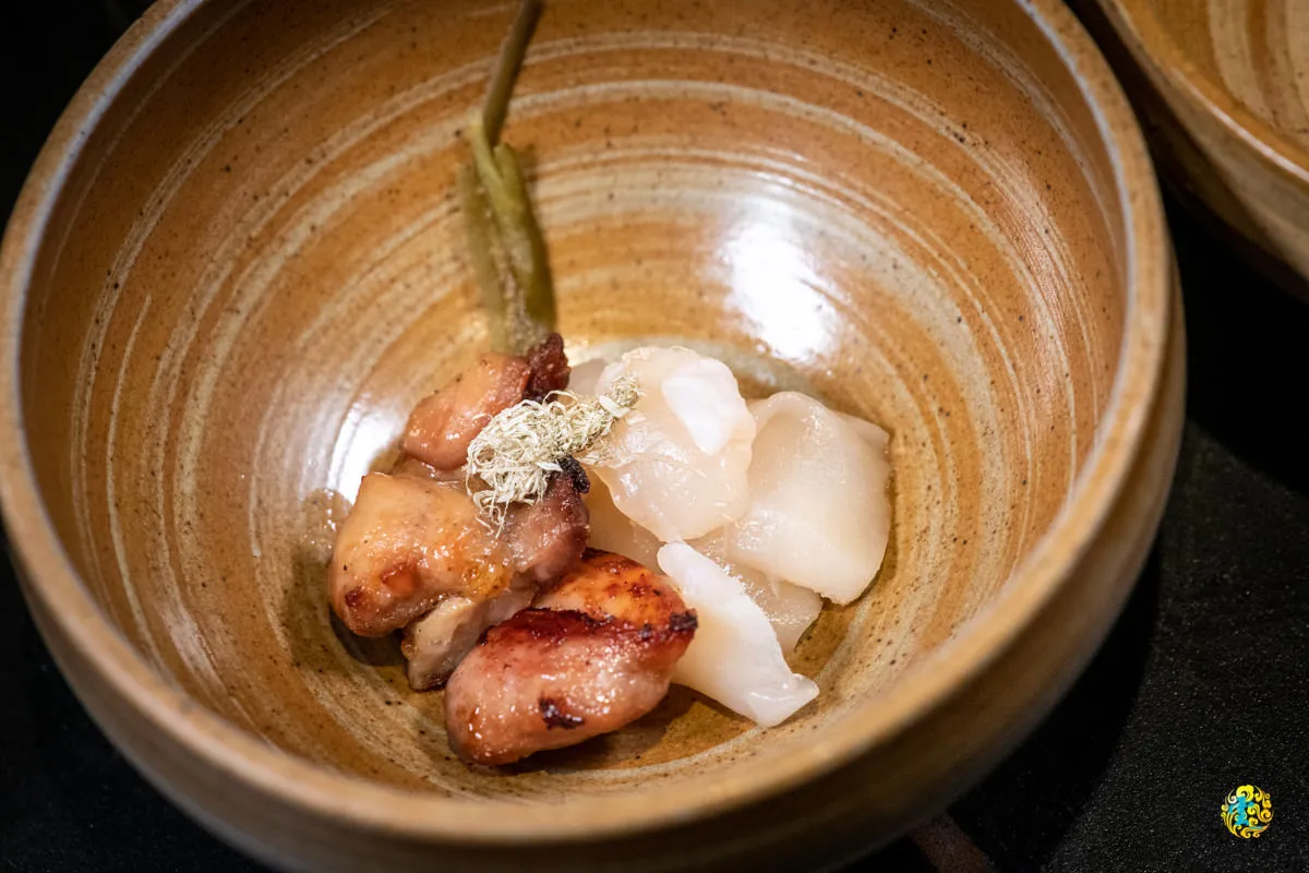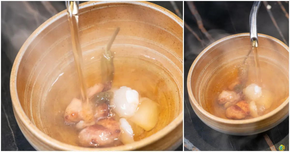 對於不吃牛的朋友,山上走走則是提供生食級干貝與雞肉,一樣是淋上宜蘭櫻桃鴨骨熬煮的熱湯,相較於牛肉湯,雞肉湯的甜度略高,昆布味也更明顯。細緻清淡的昆布滋味帶著舒適的新鮮與甘甜,撲鼻的香氣不只怡人,清澈乾淨的湯頭看了也舒服,干貝與雞肉讓口感香氣再次提升,喝一口湯,細細品味山上走走為你量身打造的快樂心情。