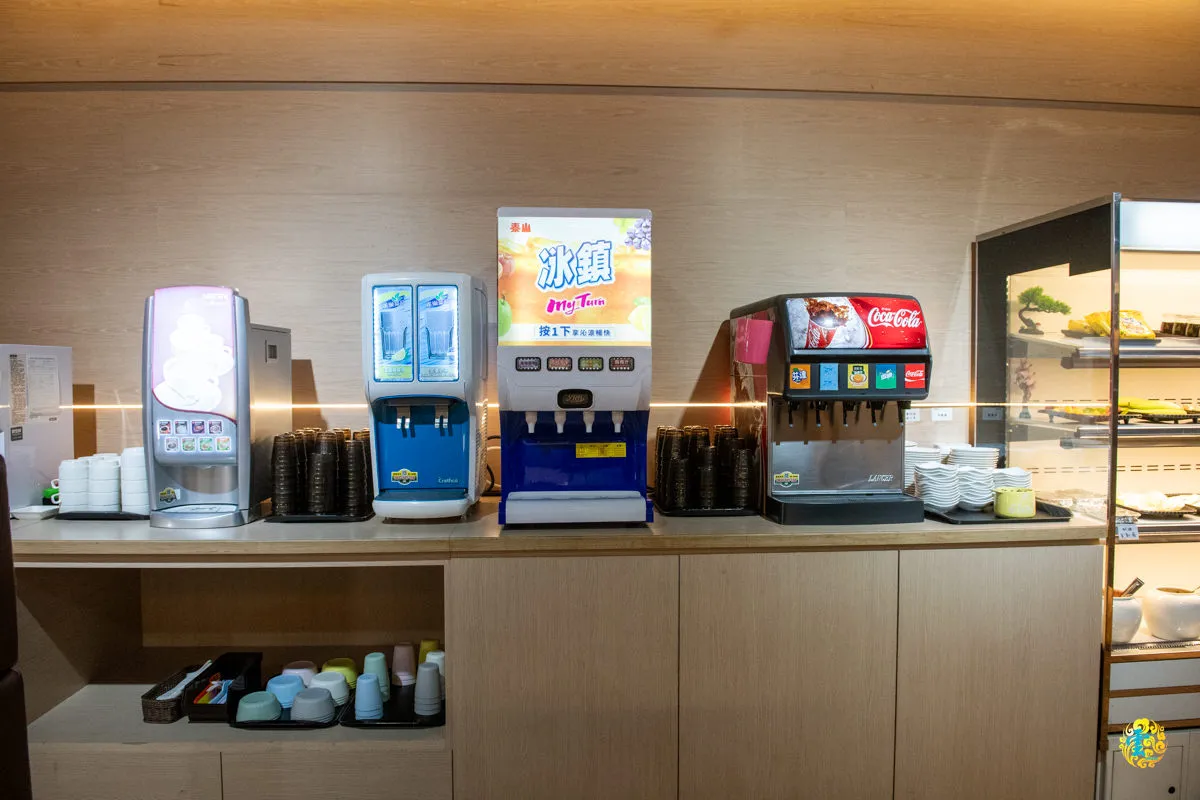 走進飲料吧,四台機器齊刷刷,不僅傳統的可樂、雪碧盡在其中,還有果汁、茶飲和咖啡等多樣選擇,就連白開水也在其中,看來是想確保你喝飽喝足的心思。