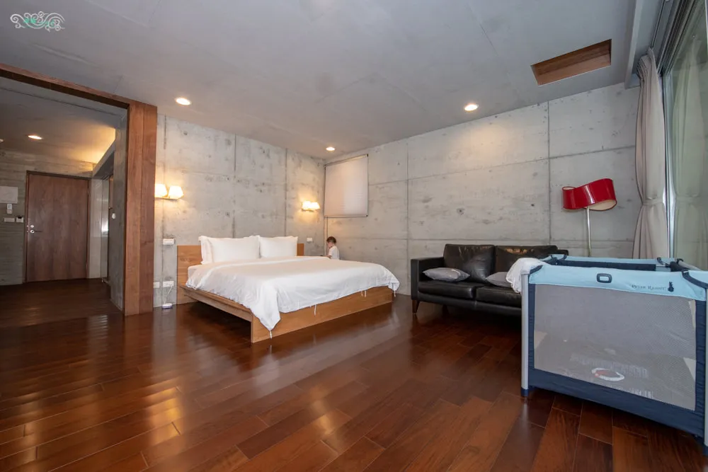 一樓前後有兩個房間,都是相同房型『體現空間』,我們這次入住後面的房間,比前面的房間略小一點點,但還是非常寬敞。雖然同是體現空間,服務人員說每個房間都有他獨特的風格,且每次入住都會特意為你安排不同的房型,讓賓客每次都能有不同且新鮮的體驗。因為我們帶著小凌雲入住,服務人員帶領我們入房後,馬上主動詢問是否有嬰兒床的需求,服務專業度真的很優質。房間內有一組大尺吋的雙人床,以及一組雙人沙發,角落還有一個水泥平台設計的休憩空間,尺寸不小的電視機前,擺放了免費的茶包、咖啡、宜蘭餅以及瓶裝礦泉水,室內拖鞋則是擺放在外面的公共空間,供旅客自行取用。冰箱就位在大門的右手邊,房間內沒有衣櫥,不過有提供掛吊用的衣架。 靜逸舒適的空間設計,寬敞無壓力的環境,住起來非常舒適。