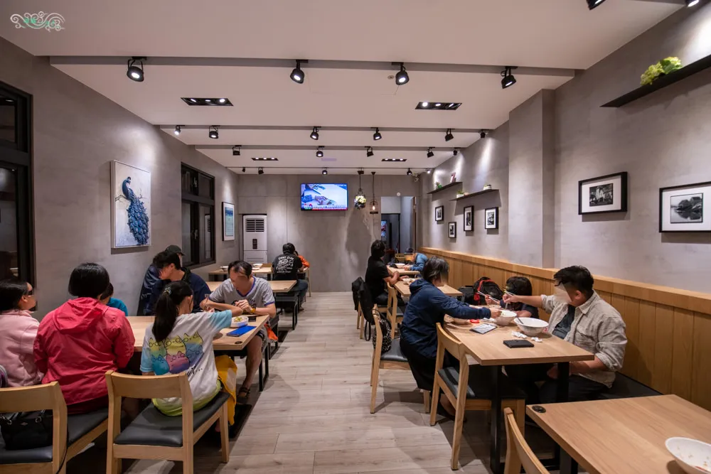 游麵館各間分店的裝潢風格都一致,也成了很好認的標誌,店門口類北歐風的設計,以木質為空間靈魂,利用淺色木紋帶來清爽與明淨的視覺感受,輔以白色磚面鋪陳明亮文青的氣息,透過綠意植栽讓空間多了些生命感。現在越來越多店家愛上素顏的水泥牆面,在透過暖色系投影光與木質桌椅,營造溫暖舒適的用餐氛圍,游麵館也是採用這樣的設計,牆上在掛些圖像,更添空間的層次感。