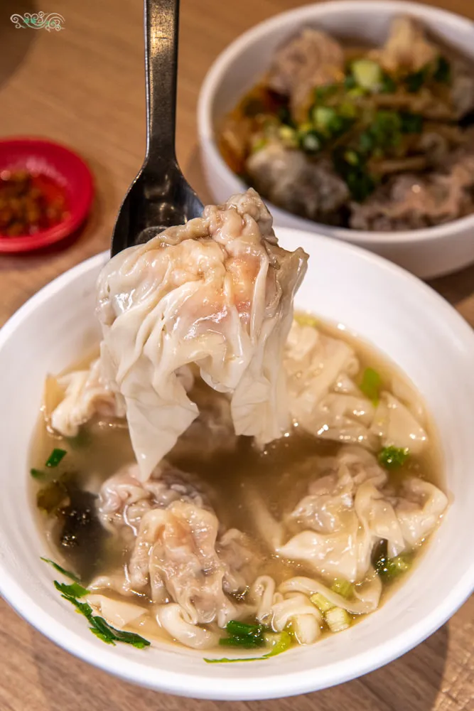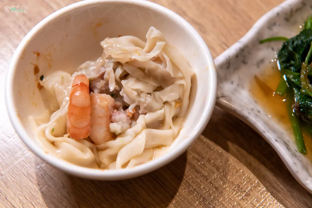 鮮蝦大餛飩是店內熱賣款,不論是鮮蝦大餛飩麵還是鮮蝦大餛飩湯,都有死忠的擁護者,凌雲這次想嚐嚐看鮮蝦大餛飩湯。碗裡有著五顆鮮蝦大餛飩,每一粒鮮蝦餛飩都非常結實飽滿,每一粒都包含兩隻完整蝦仁與鮮肉餡,皮Q餡飽滋味好,甘甜鮮美的蝦仁起了畫龍點睛之妙,與有著自然甜味的飽滿肉餡,一起在舌尖上華麗的舞蹈著,店內人氣款當之無愧。