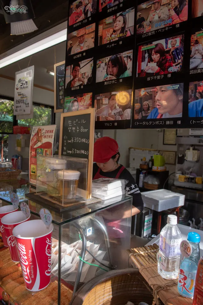 之前看過食尚玩家介紹這家金賞コロッケ可樂餅,當時就覺得很不錯,此次九州行行前特地查了些資料,這間基本上是大家激推啊。剛到的時候,隊伍還有點長,所以我們選擇繼續前行,回程再過來。回程再來前面就只有一組顧客。金賞コロッケ可樂餅可選擇的口味眾多,有馬鈴薯、牛肉、豬肉、雞肉、章魚、蟹奶油、奶酪、咖哩等等,上頭還有中、英、日、韓四種語言標示,相當貼心。女王一時之間還無法抉擇要選哪一種,除了可樂餅還有販售大分名物雞肉串跟冰淇淋,最後我跟女王選擇了金賞可樂餅與原味可樂餅,才結完帳後面又排了好幾位客人,人氣真的很高。