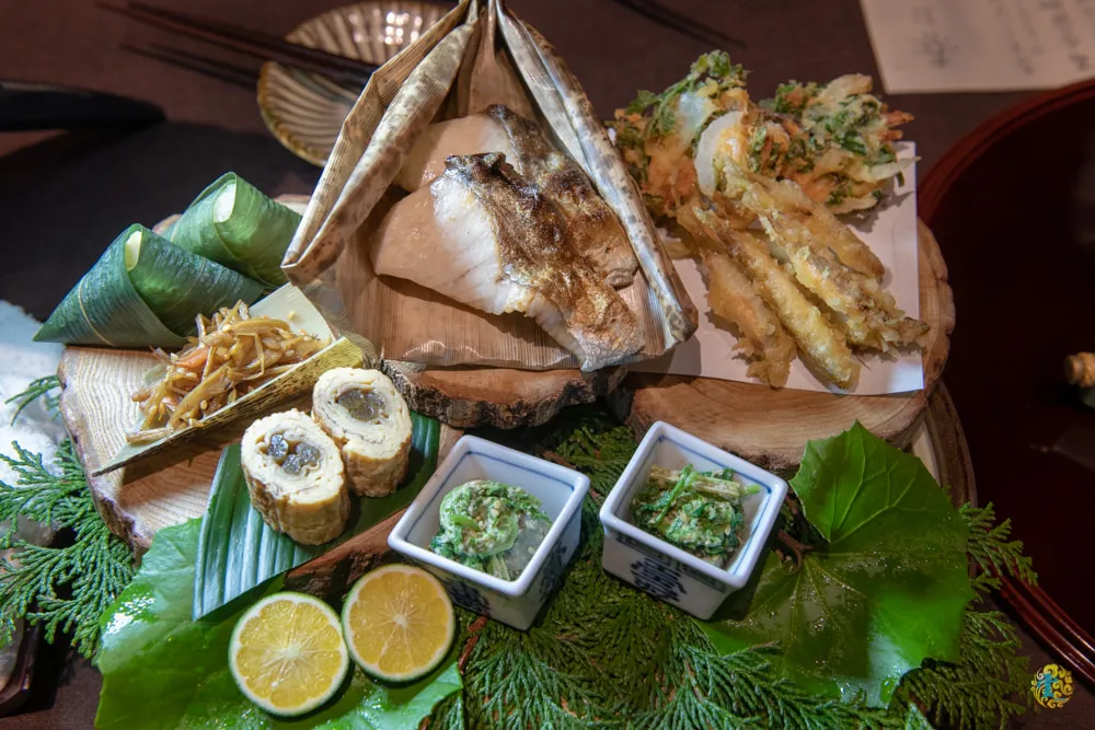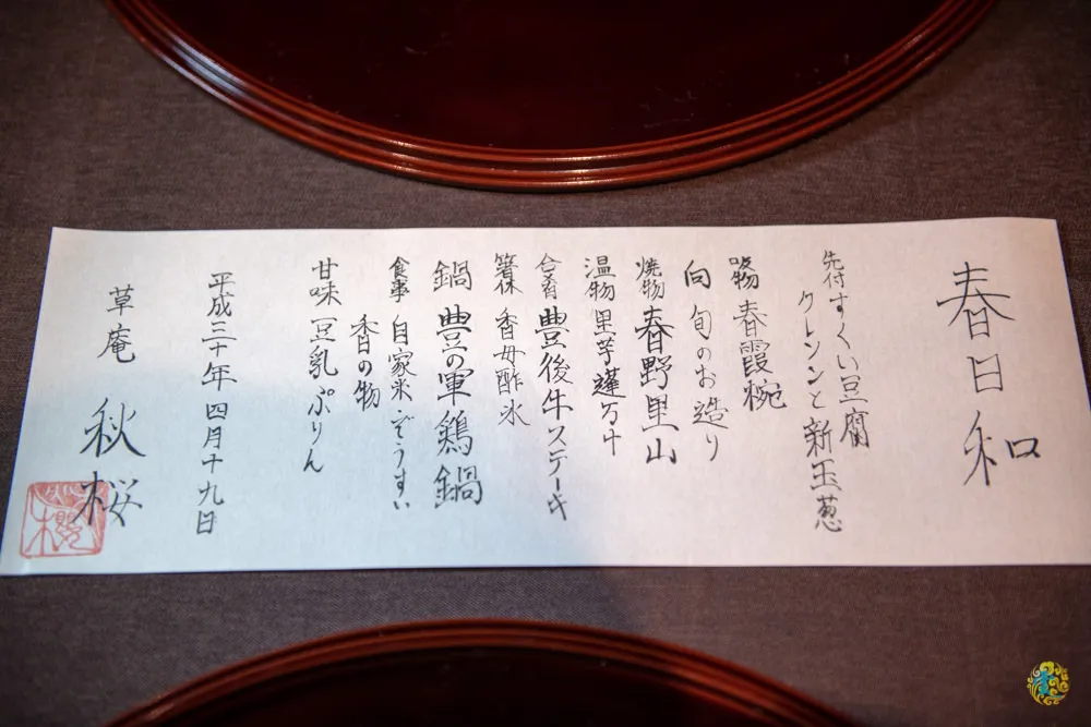 草庵秋櫻提供的是懷石料理,依據當季食材特製的料理,菜單每一季更換一次,因為是春天來訪,菜單的主題是春日和。